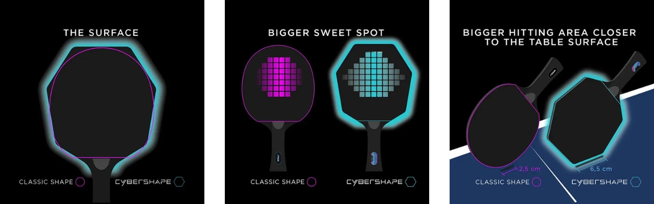 Dankzij zijn unieke vorm brengt het zeshoekige tafeltennisbatje de slagzone dichter bij de tafel. Dit zorgt voor een verhoogde responsiviteit bij korte ballen en backhand aanvallen. Deze unieke eigenschap stelt spelers in staat om controle over hun tegenstanders te nemen en het tempo van het spel met vertrouwen en precisie te bepalen.